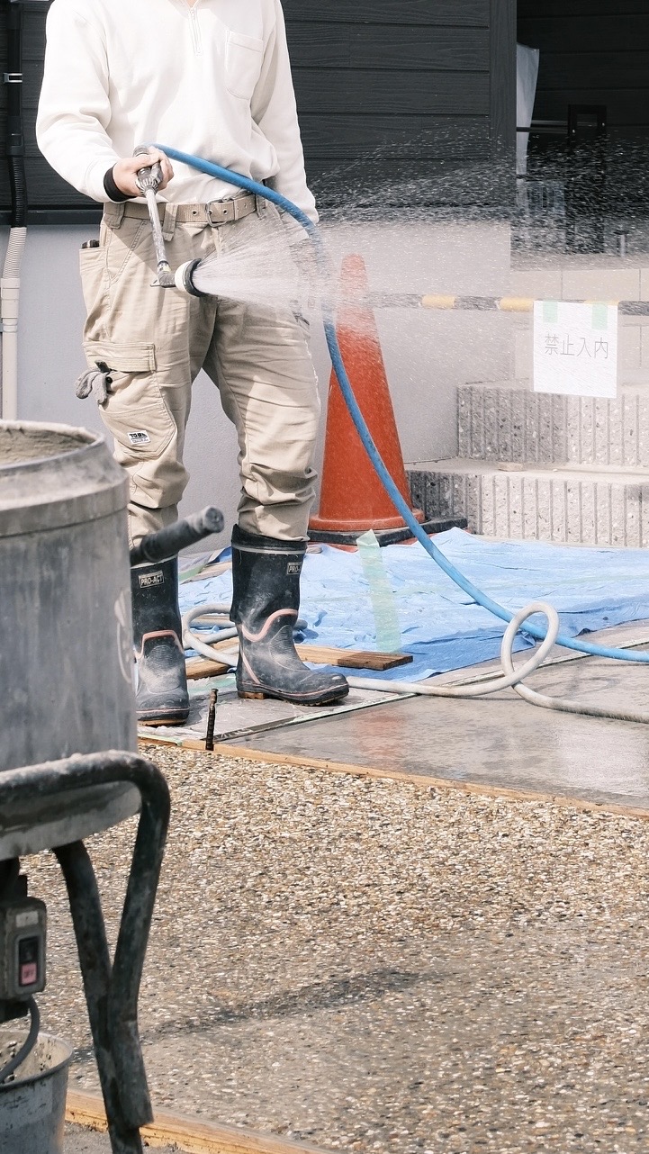 まだ雪が残る中 この日は〝洗い出し“施工を行いました。 セメントと水、石を混ぜて流し込み、均一にならした後 表面を丁寧に水で流しながら仕上げていきます。 洗いが足りない箇所や凹みがあると白っぽくムラが出てしまうため、ここはまさに職人技が光る工程。 どんな仕上がりになるのか、完成が楽しみです♪