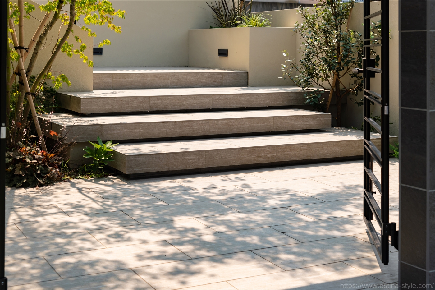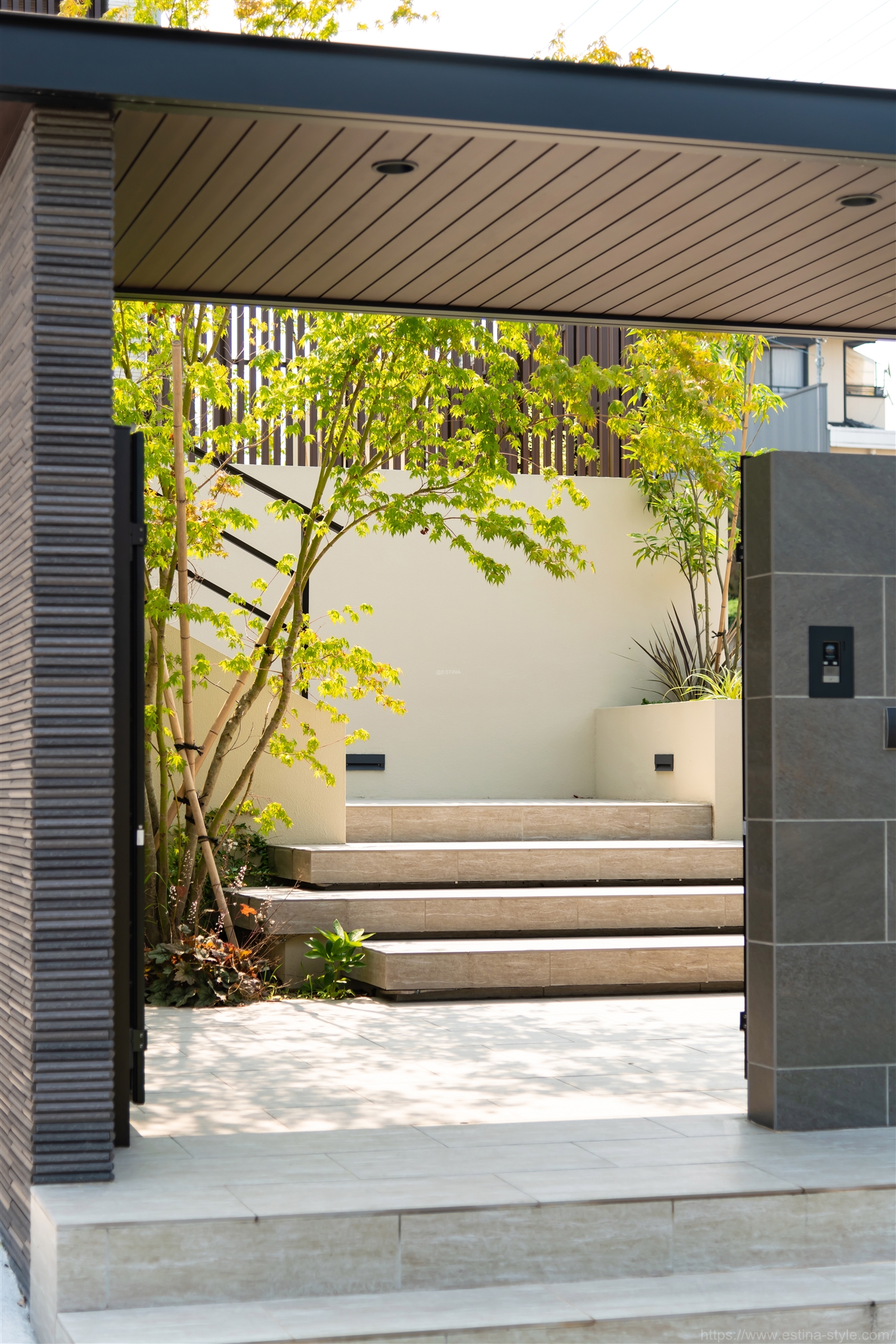 門をくぐるとソヨゴ のグリーンが訪れ人をお出迎え。 アプローチ に落ちる木陰の陰影が美しいてすね。 こちらは重厚感ある建物に合わせたクローズド外構 。 敷地高低差を活かし、 段階ステップを設け、植栽を配置しました。 夜はライティング により一段と雰囲気が素敵になります。