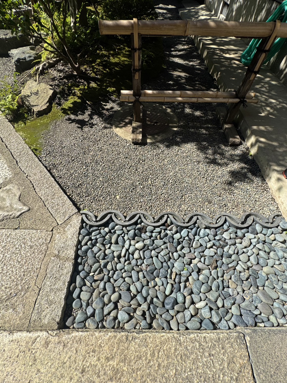 写真のように 異なる素材の境界部分に、地面に埋め込むよう瓦が使用されています。
