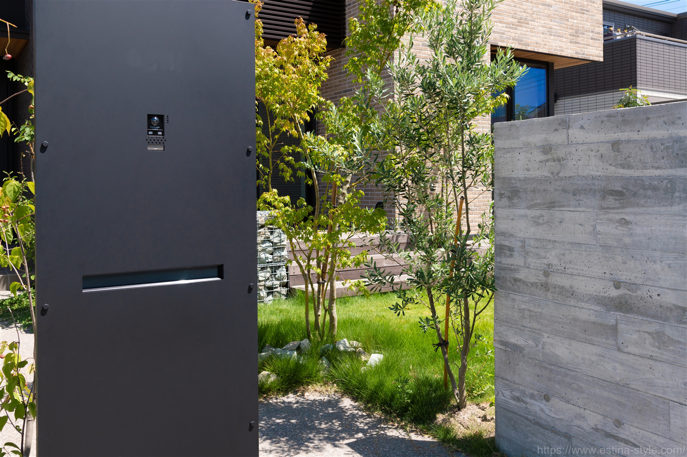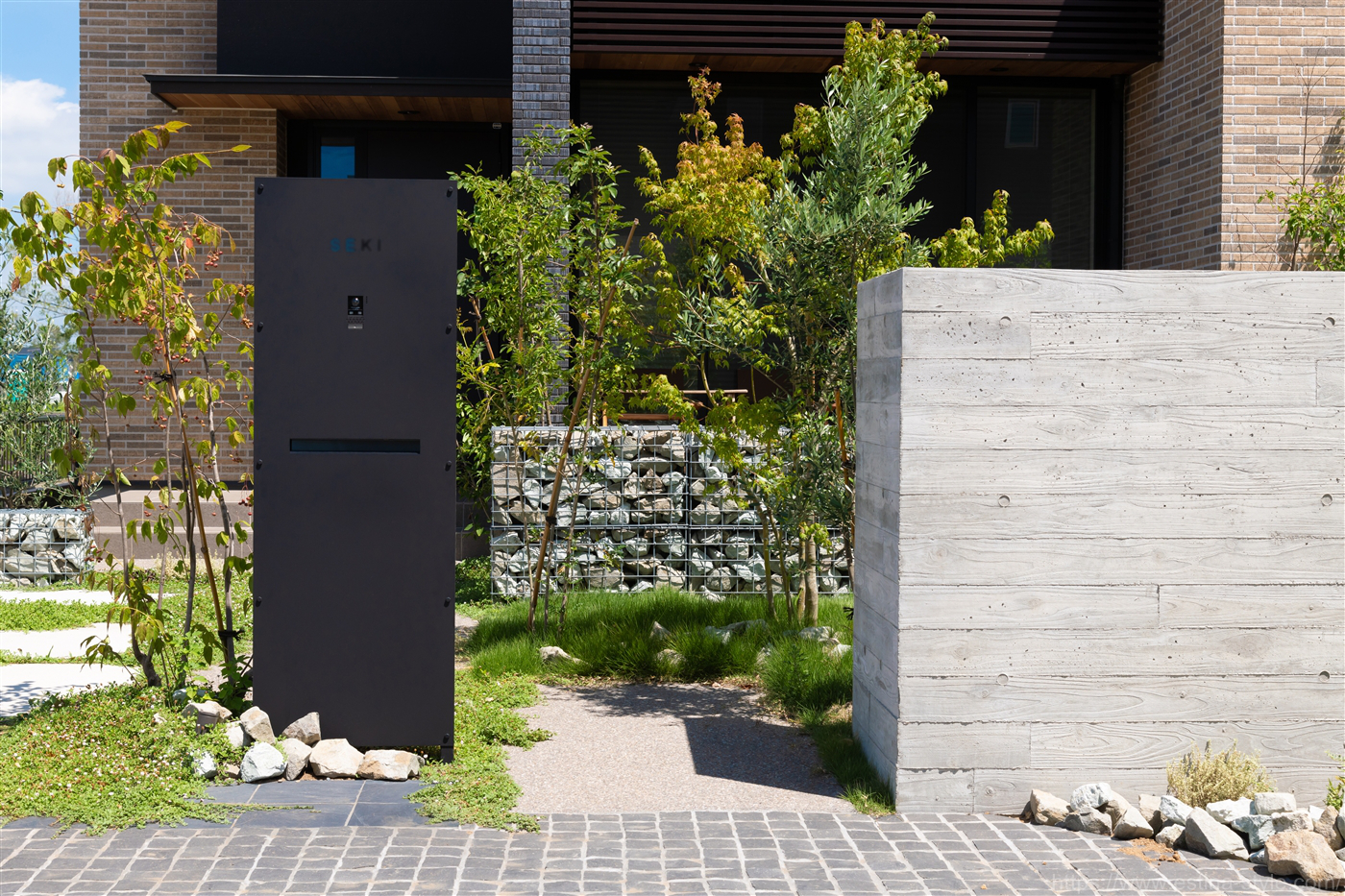 空間を活かしながらも適度な量の植栽が美しい、ナチュラルモダンのお庭♪ 奥にはスチールメッシュをボックス状にして、天然石を詰めたガビオンを配置しています。