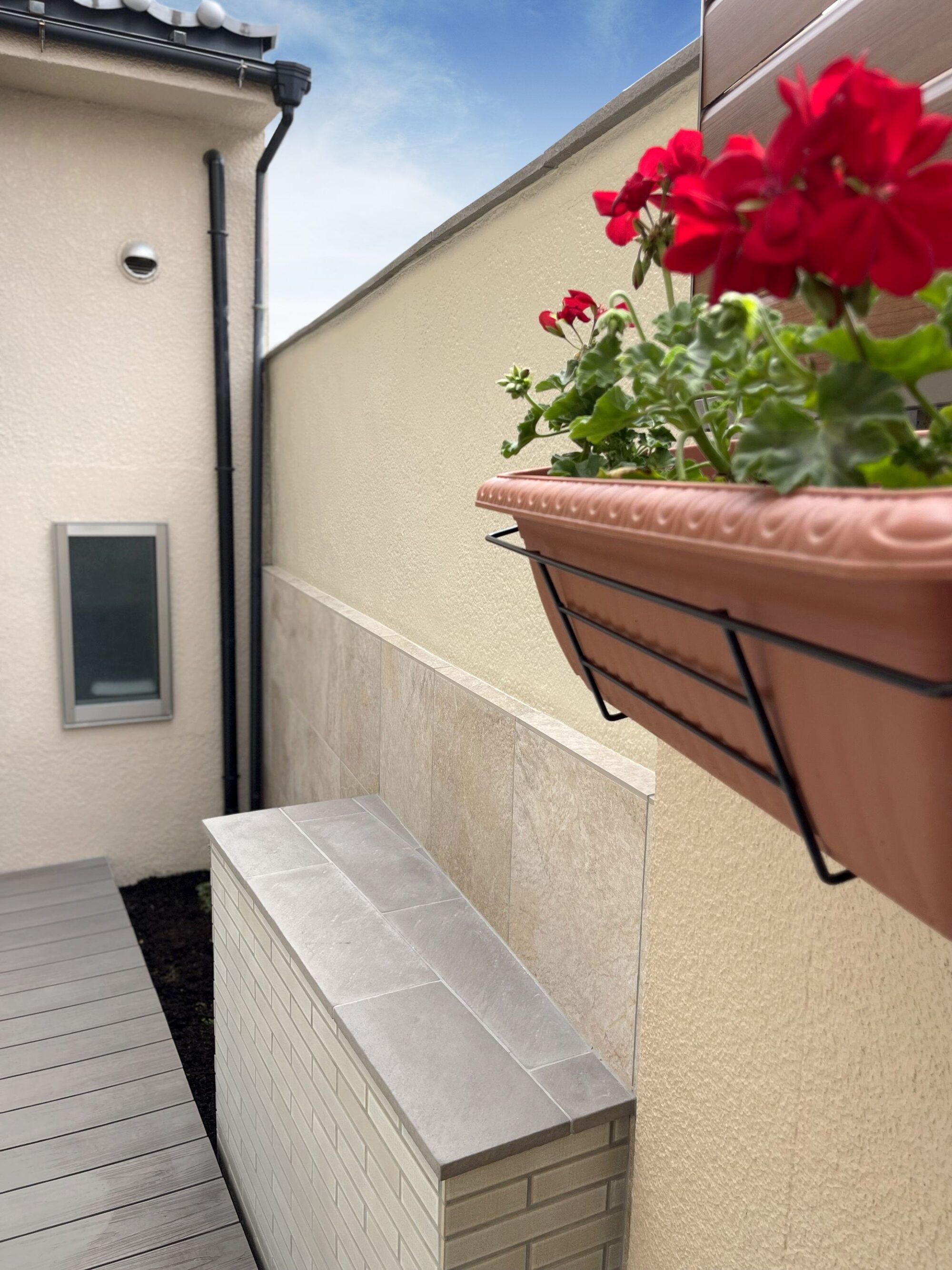 ・デッキと花台でお庭を楽しめる空間づくり