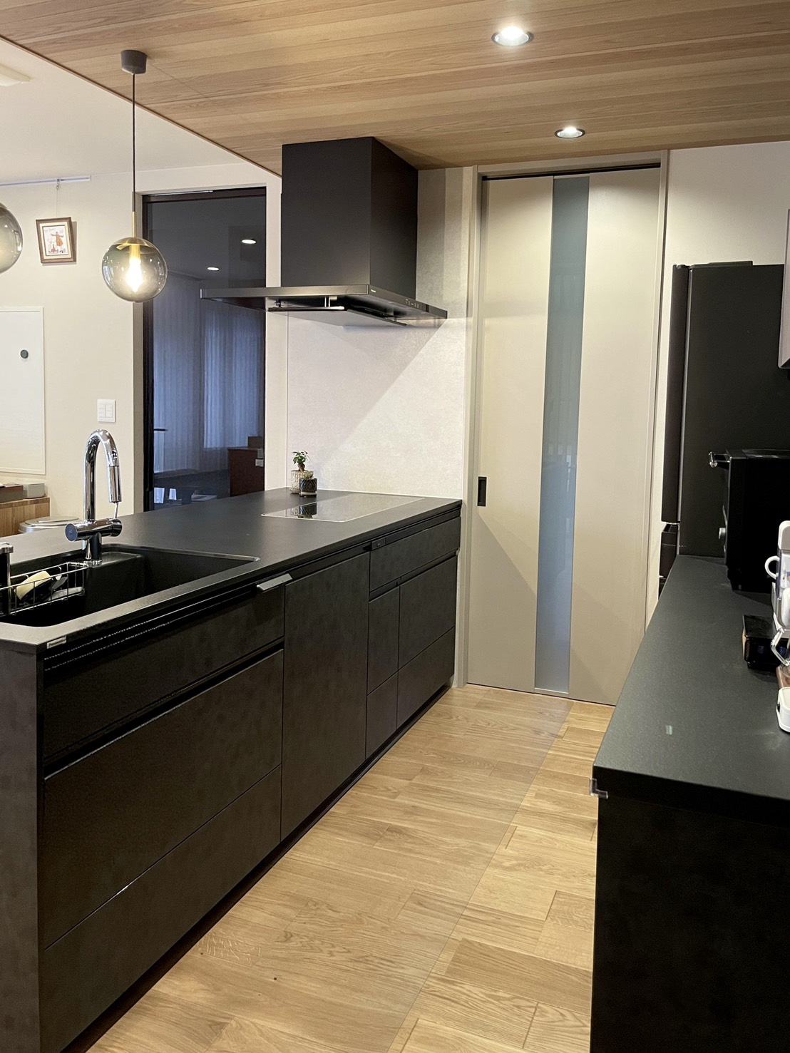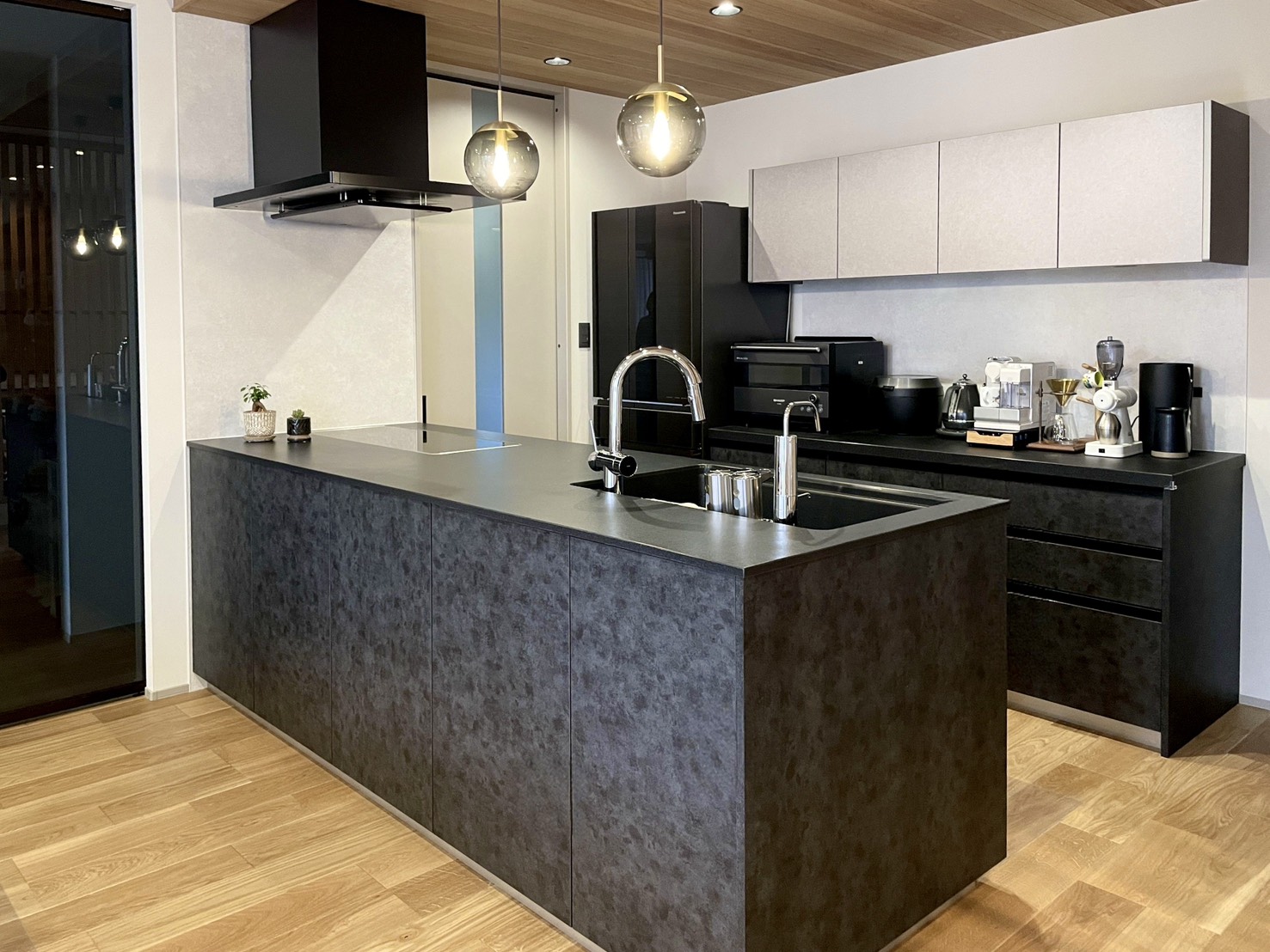 キッチンは家電からシンクまでブラックで統一。